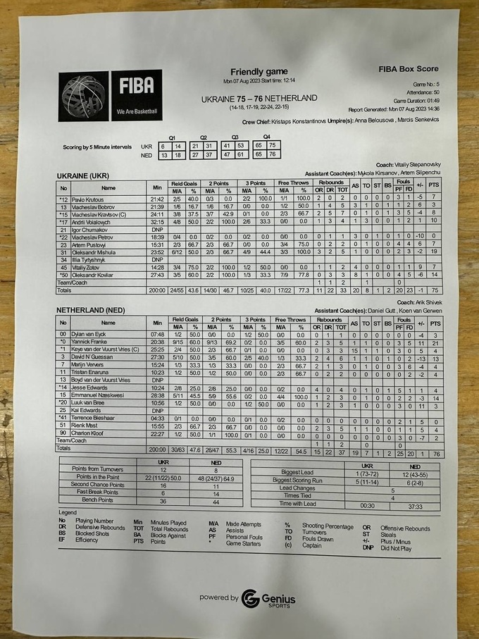 Україна – Нідерланди – 75:76 (14:18, 17:19, 22:24, 22:15)