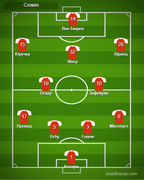 «Славія»: Коларж, Масопуст, Голеш, Огбу, Провод, Зафейріс (Юрасек, 90), Оскар, Шранц, Лінгр (Шевчік, 81), Юречка (Валлем, 80), Ван Бюрен (Читіл, 80).
