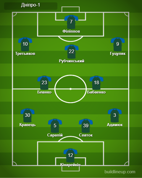 «Дніпро-1»: Кінарейкін, Кравець, Сарапій, Адамюк (Білл, 81), Сваток (Пасіч, 46), Третьяков (Лєднєв, 12), Бабенко (Піхальонок, 61), Бланко, Рубчинський, Гуцуляк, Філіппов (Ківінда, 81).