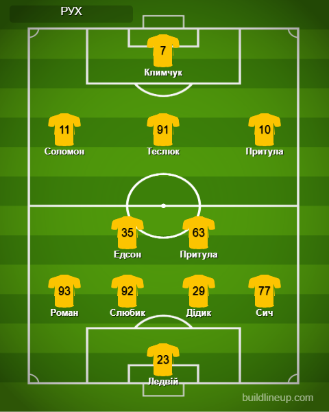 «Рух»: Ледвій – Сич, Слюбік, Дідик, Роман, Едсон, Сапуга, Притула (Таллес, 67), Теслюк (Квасниця, 56), Климчук, Соломон (Руніч, 56, Пастух, 90+3).