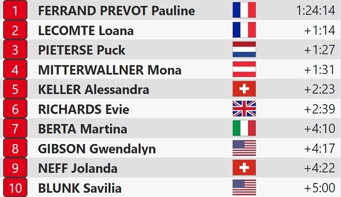У жінок своє друге золото на нинішньому чемпіонаті світу завоювала француженка Полін Ферран-Прево, яка раніше виграла шорт-трек. Сьогодні вона випередила партнерку по команді Лоану Лекомт і нідерландку Пук Пітерс. Українка Яна Беломоіна посіла 39-те місце з 60 учасниць.