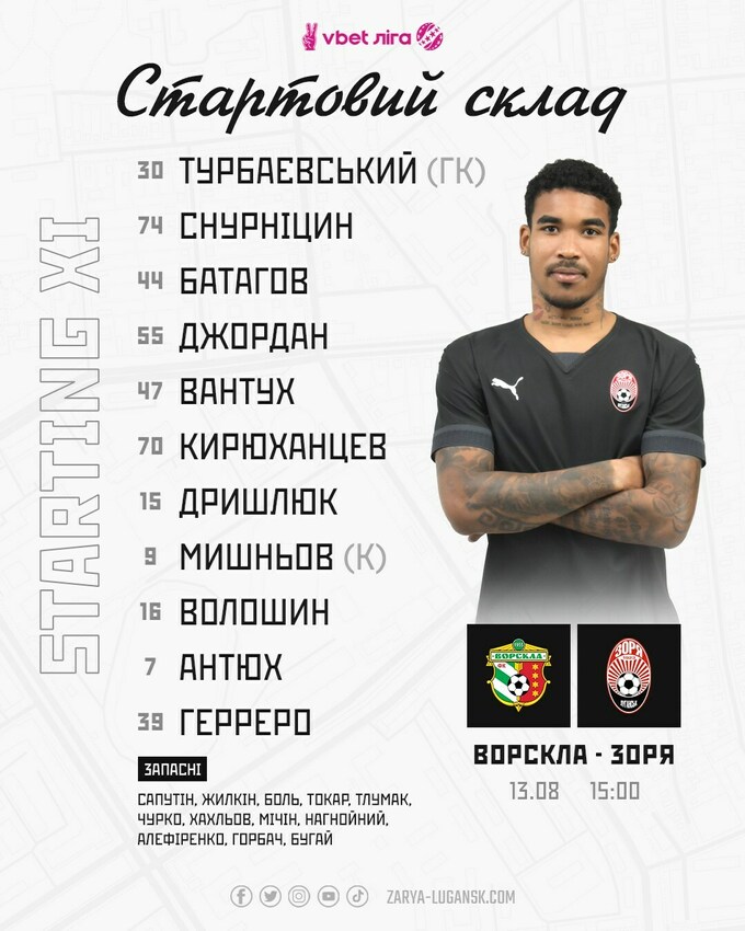 «Зоря»: Турбаєвський – Вантух, Батагов, Джордан, Снурніцин – Дришлюк, Мишньов (Мичин, 85) – Антюх (Чурко, 86), Волошин (Алефіренко, 63), Кирюханцев – Герреро.