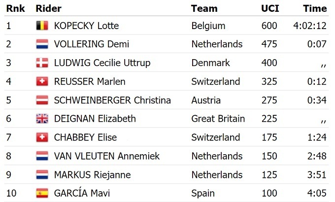 Срібло у Демі Воллерінг із Нідерландів, бронза – у данки Сесілі Уттруп Людвіг. Для 27-річної Копекі це третє золото на нинішньому чемпіонаті світу. Перші два були завойовані на треку – у гонці на вибування і гонці за очками.