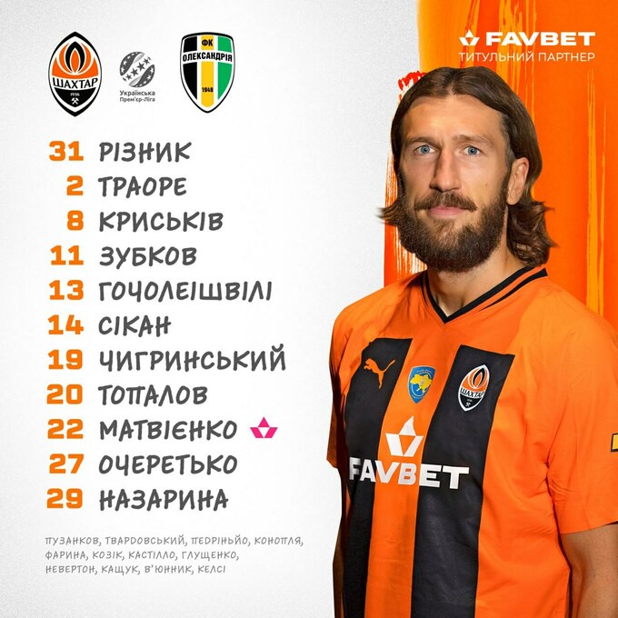 Запасні: Пузанков, Твардовський, Педріньйо, Конопля, Фарина, Глущенко, Кащук.