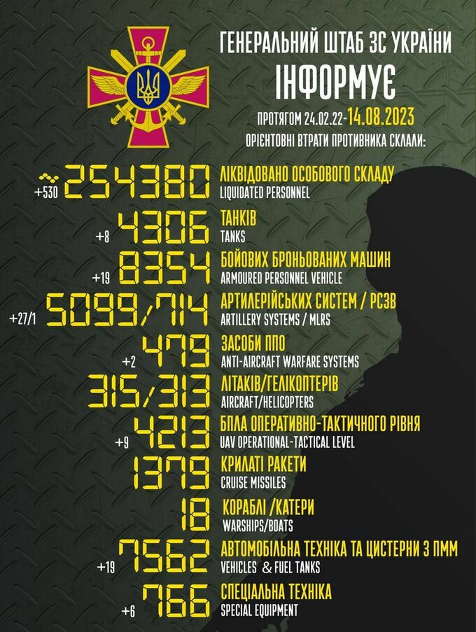 Пропонуємо до вашої уваги зведення загальних бойових втрат росії з 24.02.2022 по 13.08.2023.