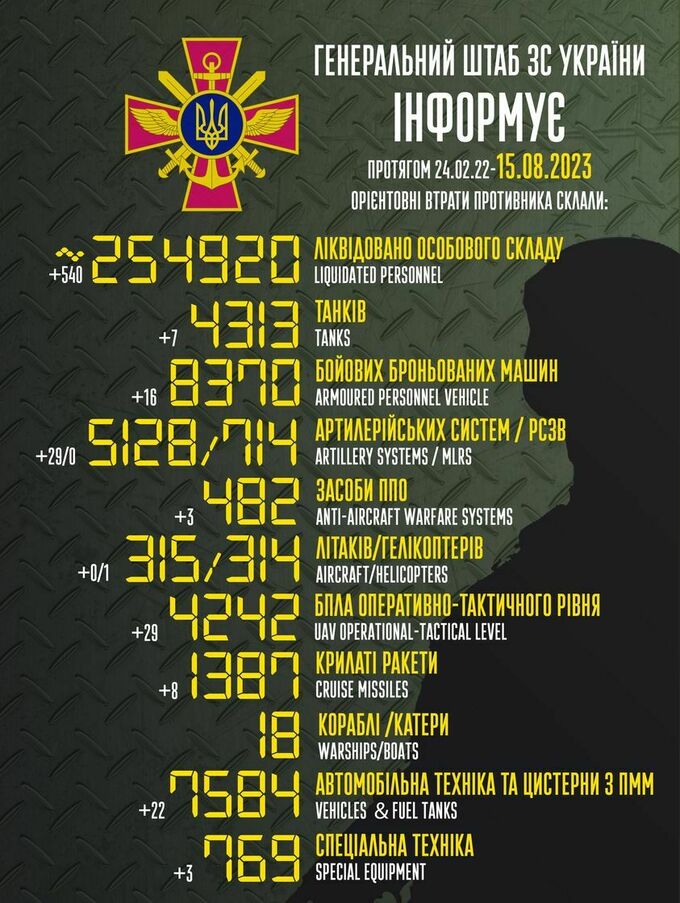 Пропонуємо до вашої уваги зведення загальних бойових втрат росії з 24.02.2022 по 15.08.2023.