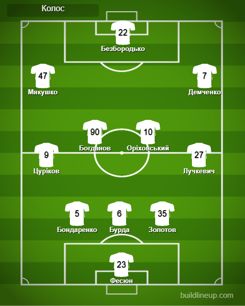 «Колос»: Фесюн, Цуріков, Бурда, Бондаренко, Золотов, Лучкевич, Оріховський (Мілько, 89), Богданов (Велетень, 89), Мякушко (Болбат, 46), Безбородько (Салабай, 67), Демченко (Ільїн, 67).