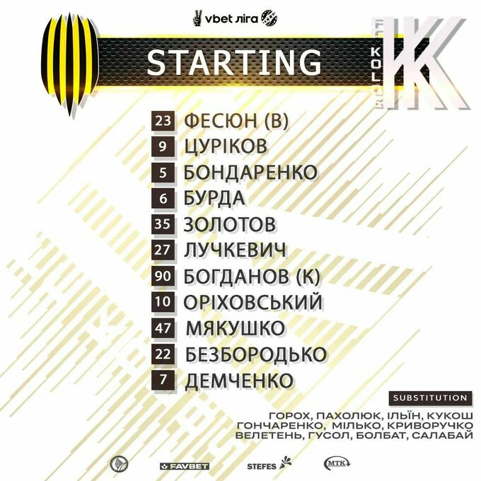 Запасні: Горох, Пахолюк, Гончаренко, Кукош, Криворучко, Гусол.
