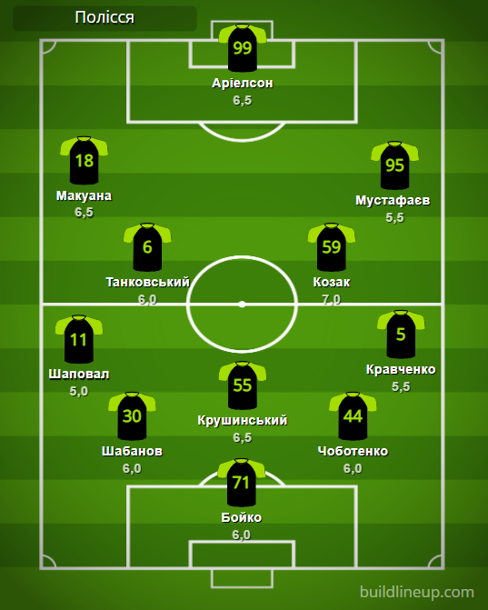 «Полісся»: Д. Бойко – Шаповал, Шабанов, Крушинський (Огіря, 46), Чоботенко (Гітченко, 74), Кравченко – Макуана, Козак, Танковський (Смоляков, 56), Мустафаєв (Будківський, 46) – Аріелсон (Кушніренко, 55).