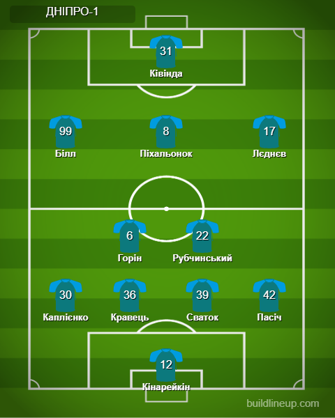 «Дніпро-1»: Кінарейкін - Пасіч (Пуріта, 72), Сваток, Кравець, Каплієнко - Горін (Когут, 54), Рубчинський - Лєднєв (Пірес, 79), Піхальонок, Білл (Танчик, 54) - Ківінда (Філліпов, 46).