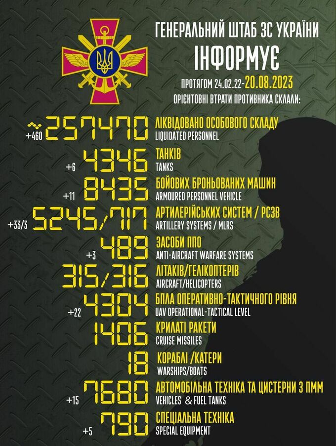 Пропонуємо до вашої уваги зведення загальних бойових втрат росії з 24.02.2022 по 20.08.2023.