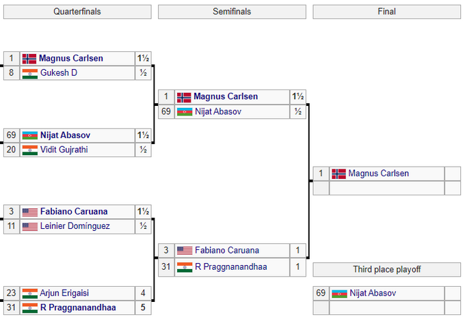 Фабіано Каруана зі США та Рамешбабу Прагнанандха з Індії визначать другого фіналіста на тай-брейку.