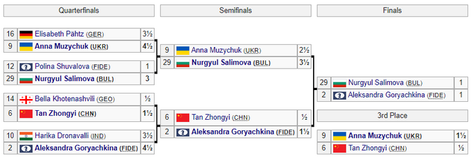 - Анна Музичук (Україна) [9] – Тань Чжун'ї (Китай) [6] – 1.5:0.5