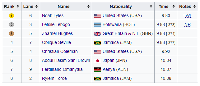 Фінальний чоловічий забіг виграв американський легкоатлет Ноа Лайлс. Він показав час 9.83 с і став 4-кратним чемпіоном світу. Раніше Ноа двічі перемагав у бігу на 200 метрів і один раз – в естафеті 4х100 м.