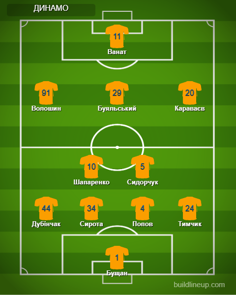 «Динамо»: Бущан - Тимчик, Попов, Сирота, Дубінчак - Сидорчук, Шапаренко - Караваєв (Беніто, 90+5), Буяльський (Царенко, 90), Волошин (Діалло, 76) - Ванат.