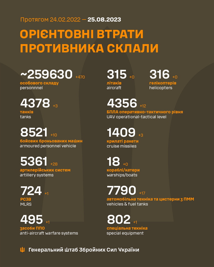 Пропонуємо вашій увазі зведення загальних бойових втрат росії з 24.02.2022 по 25.08.2023.