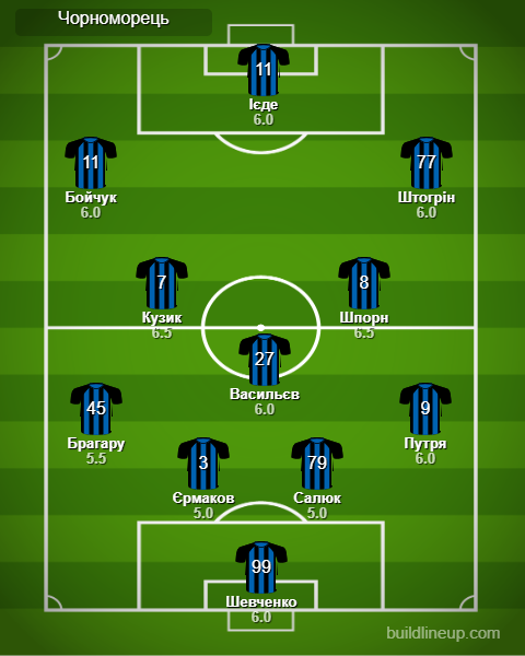 «Чорноморець»: Шевченко, Брагару (Хадіда, 46, Гучек, 88), Єрмаков, Салюк, Путря, Васильєв, Кузик, Шпорн, Штогрін (Вакула, 75), Ієде (Дада, 75), Бойчук (Авагімян, 46).