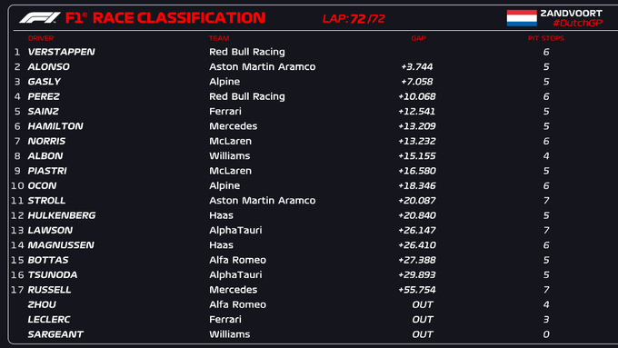 Відбулася гонка у рамках Гран-прі Нідерландів. Перемогу здобув місцевий улюбленець Макс Ферстаппен, який стартував з поула та поїхав до чергового тріумфу.