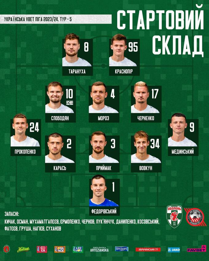 «Оболонь»: Федорівський – Вовкун, Карась, Приймак – Прокопенко, Слободян (Груша, 46), Мороз, Черненко, Мединський – Тарануха (Нагієв, 81), Краснопір (Суханов, 69).