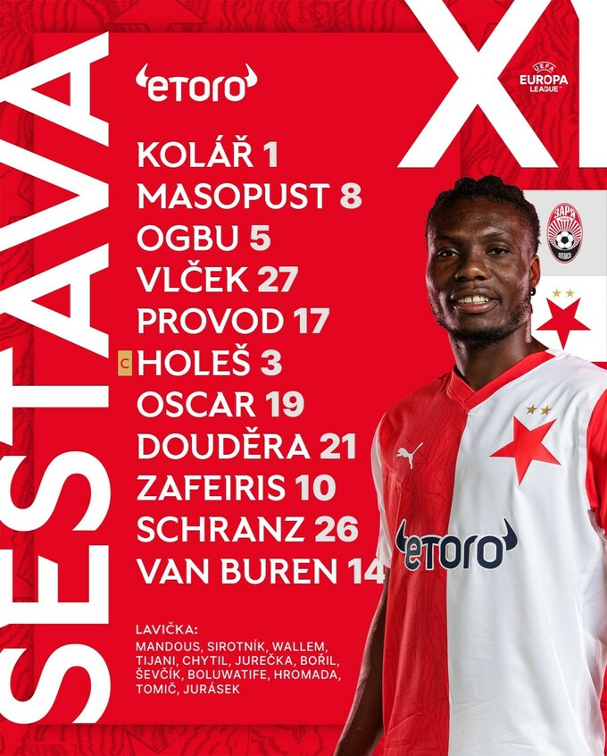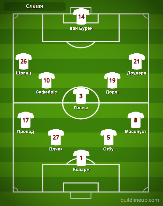 «Славія»: Коларж – Провод (Томич, 81), Влчек, Огбу (Шевчик, 46), Масопуст – Шранц (Тіджані, 73), Зафейріс, Голеш, Дорлі, Доудера (Юрасек, 46) – ван Бурен (Юречка, 56).