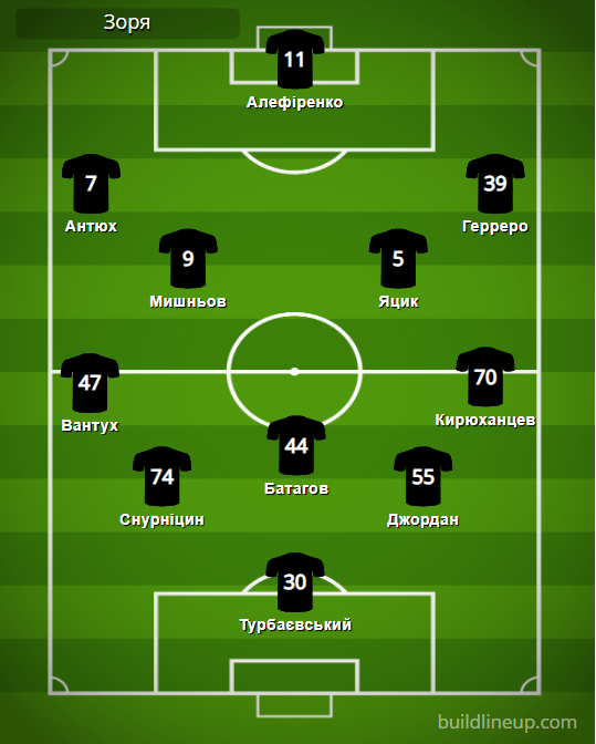 «Зоря»: Турбаєвський – Вантух, Снурніцин, Батагов, Джордан, Кирюханцев – Антюх (Горбач, 81), Яцик (Дришлюк, 46), Мишньов (Чурко, 81), Герреро – Алефіренко (Волошин, 67).