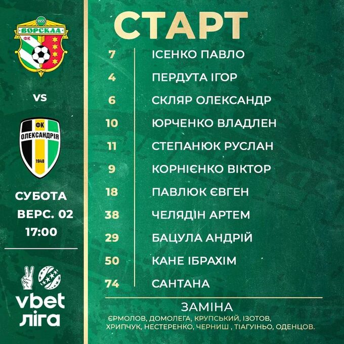 «Ворскла»: Ісенко – Корнієнко, Бацула, Сантана, Пердута – Скляр, Павлюк – Челядін, Юрченко (Нестеренко, 88), Кане – Степанюк.