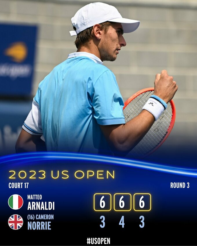 22-річний Арнальді в трьох партіях розібрався з британцем Кемероном Норрі, Маттео раніше далі другого кола на мейджорах не заходив.