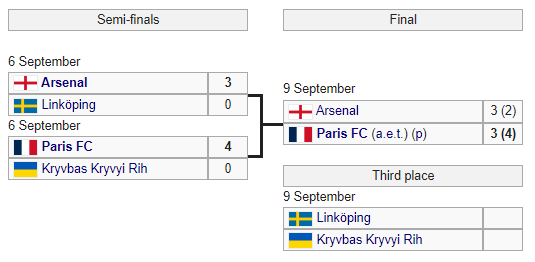 У матчі за 1-ше місце групи 1-го раунду «Париж» вибив лондонський «Арсенал» у серії пенальті – 4:2. Основний час гри завершився з рахунком 3:3.