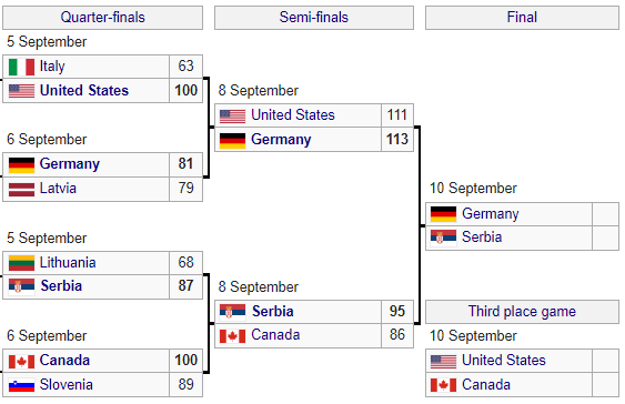 Американська дрім-тім зазнала двох поразок на турнірі. Підопічні Стіва Керра поступилися у групі Литві з рахунком 104:110. А у півфіналі зазнали поразки від Німеччини – 111:113. Матч за третє місце – шанс взяти медалі на невдалому для американців турнірі.