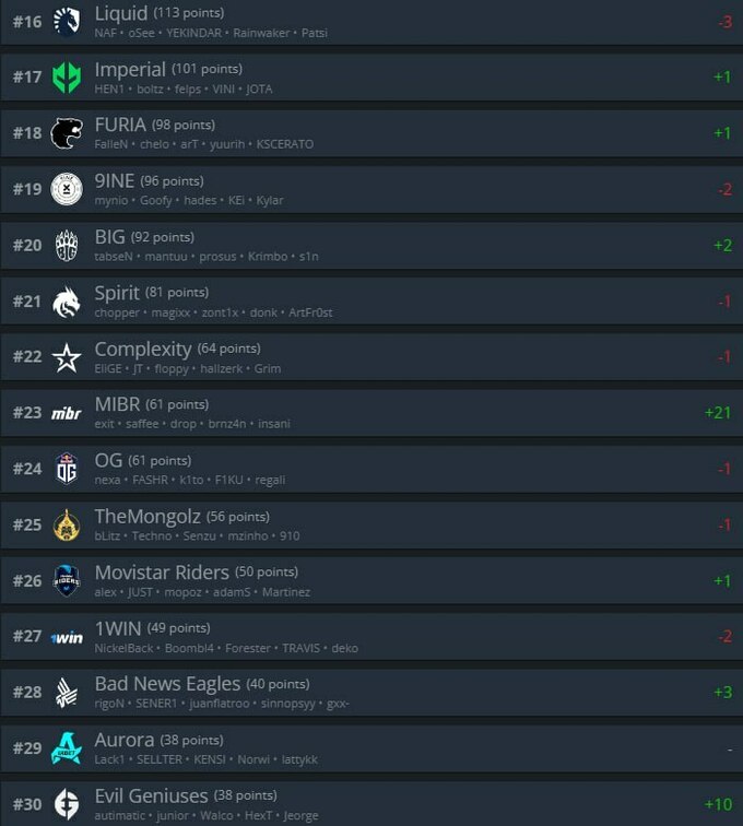 Істотно піднялися команди MIBR та EG, хоч і вилетіли з кваліфікації ESL Pro League. Перша вийшла на 23 місце, піднявшись на 21 сходинку, а друга – на 30 із 40 місця.