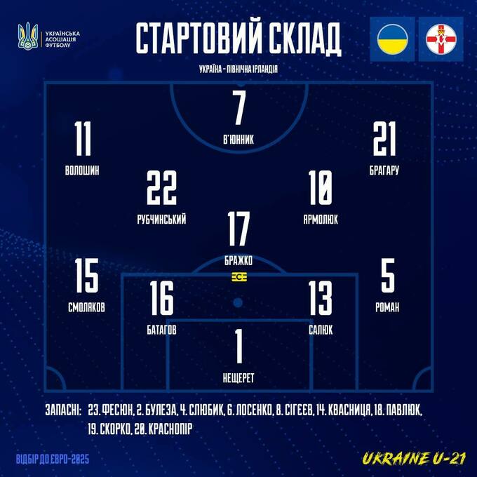 Україна U-21: Нещерет – Смоляков, Багатов, Салюк, Роман – Рубчинський, Бражко, Ярмолюк (Лосенко, 88) – Волошин (Квасниця, 57), В’юнник (Краснопір, 68), Брагару.