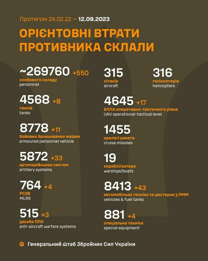 Пропонуємо вашій увазі зведення загальних бойових втрат росії з 24.02.2022 по 12.09.2023.