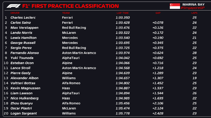 У першій практиці найшвидшими були пілоти Феррарі, а Шарль Леклер трохи випередив Карлоса Сайнса. Топ-3 замкнув Макс Ферстаппен.