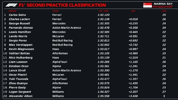 У другій сесії найкращими знову були гонщики Феррарі, але цього разу Сайнс випередив партнера. Топ-3 замкнув Джордж Расселл.