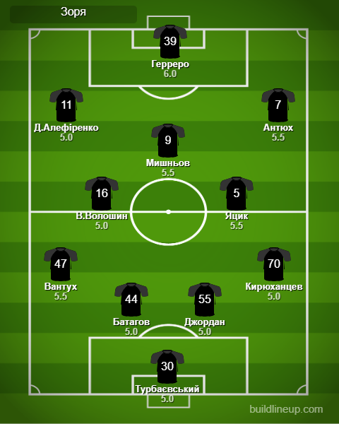 «Зоря»: Турбаєвський, Батагов (Снурніцин, 56), Джордан, Вантух, Кирюханцев, Яцик, Мишньов (Чурко, 72), В. Волошин (Нагнойний, 46), Антюх, Д. Алефіренко (Венделл, 72), Герреро.
