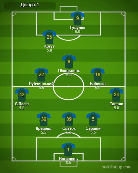 «Дніпро-1»: Волинець, Сарапій, Сваток, Кравець, Танчик (Мірошніченко, 70), Бабенко, Рубчинський, Когут, Піхальонок, Є.Пасіч (Лєднєв, 55), Гуцуляк (Філіппов, 84).