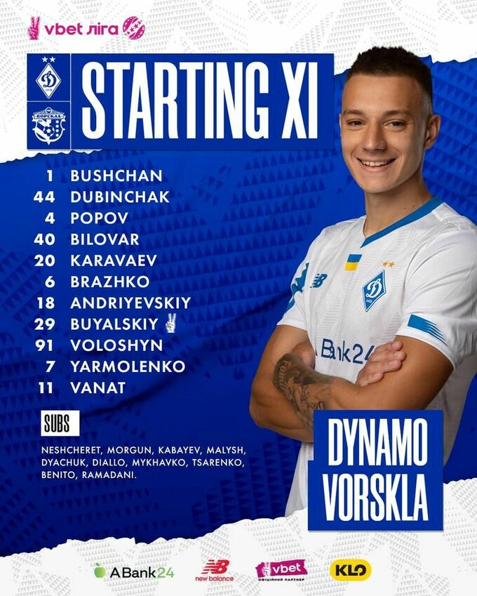 «Динамо» Київ: Бущан – Дубінчак, Попов, Біловар, Караваєв – Андрієвський (Рамадані, 86), Бражко – Волошин (Кабаєв, 60), Буяльський, Ярмоленко – Ванат (Беніто, 77).