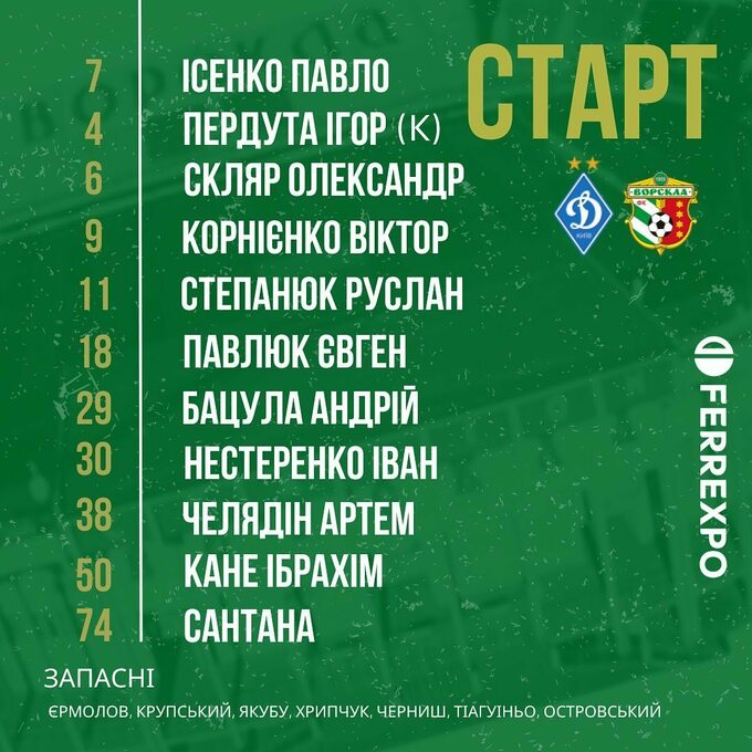 Запасні: Нещерет, Моргун, Малиш, Дячук, Діалло, Михавко, Царенко.