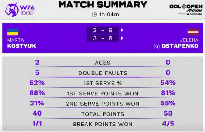 Мінус 3 за ніч. Костюк без шансів програла Остапенко в Гвадалахарі