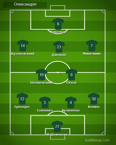 «Олександрія»: М.Шевченко, Кравченко, Савченко (Шостак, 46), Ковалець (Смирний, 85), Микитишин (Шулянський, 46), Сігеєв, Ернандес, Кулаковський (Андрейчук, 46), Білошевський, Джевані (Безерра, 70), Копина