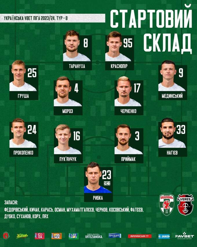 Запасні: Федорівський, Кичак, Фатєєв, Муха, Косовський, Осман, Карась, Корх, Лях.