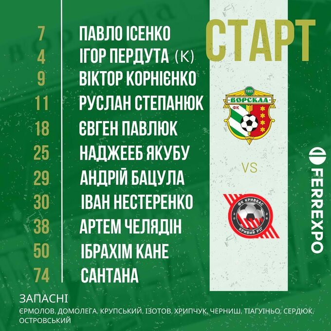 «Ворскла»: Ісенко – Корнієнко, Бацула, Сантана (Островський, 84), Пердута – Якубу (Хрипчук, 69), Павлюк – Челядін (Крупський, 84), Нестеренко, Кане – Степанюк.