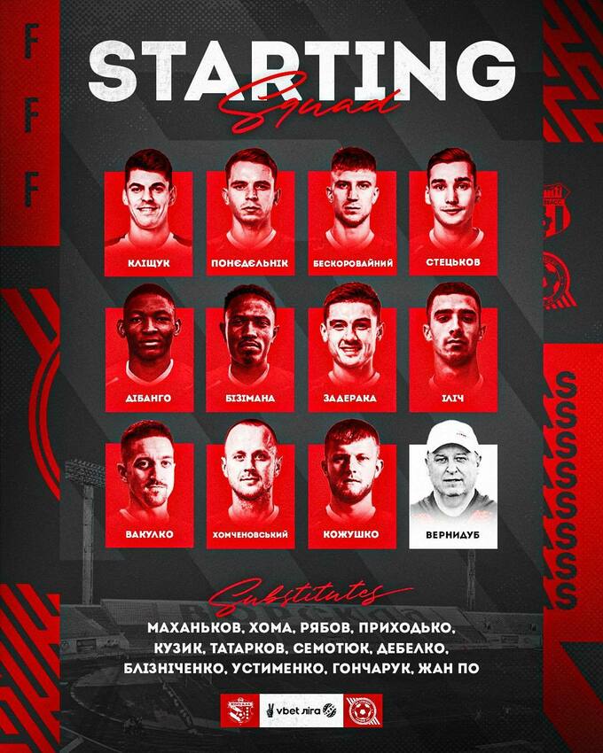 Запасні: Маханьков, Хома, Рябов, Кузик, Семотюк, Блізніченко, Устименко, Гончарук.