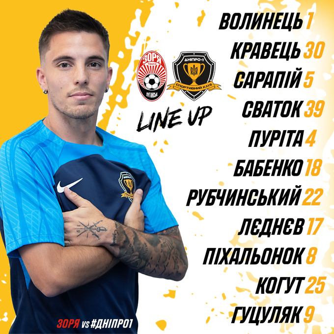 У неділю, 24 вересня, відбудеться матч восьмого туру чемпіонату України з футболу, в якому гратимуть СК «Дніпро-1» і луганська «Зоря». Гра пройде у Львові? на полі стадіону «Україна». Стартовий свисток харківської арбітрині Катерини Монзуль має прозвучати о 15:00.