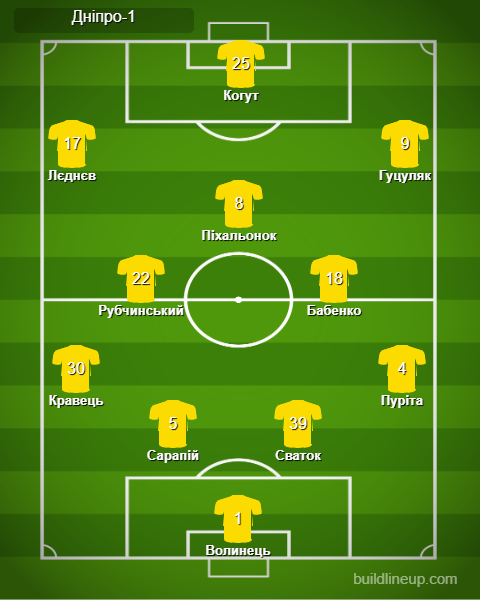 «Дніпро-1»: Волинець, Кравець, Сарапій, Сваток, Пуріта (Гаджиєв, 79), Рубчинський (Мірошніченко, 79), Когут (Є. Пасіч, 58), Піхальонок (Вітіньо, 67), Бабенко, Лєднєв, Гуцуляк.