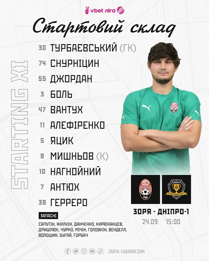 Заміни у складі Зорі. Данченко замінив Боля, Волошин - Мишньова, Чурко - Антюха.