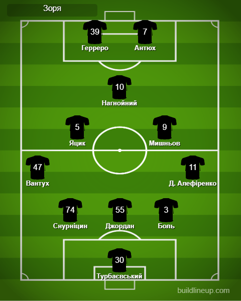 «Зоря»: Турбаєвський, Боль (Данченко, 77), Джордан, Снурніцин, Яцик, Антюх (Чурко, 77), Вантух, Мишньов (В.Волошин, 77), Нагнойний, Д. Алефіренко, Герреро.