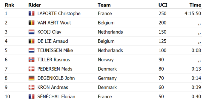 Французький велогонщик Крістоф Лапорт завоював золото чемпіонату Європи 2023 року в груповій гонці. Він випередив бельгійця Воута Ван Арта і господаря гонки, нідерландця Олава Коя. Усі три призери представляють команду «Jumbo Visma».