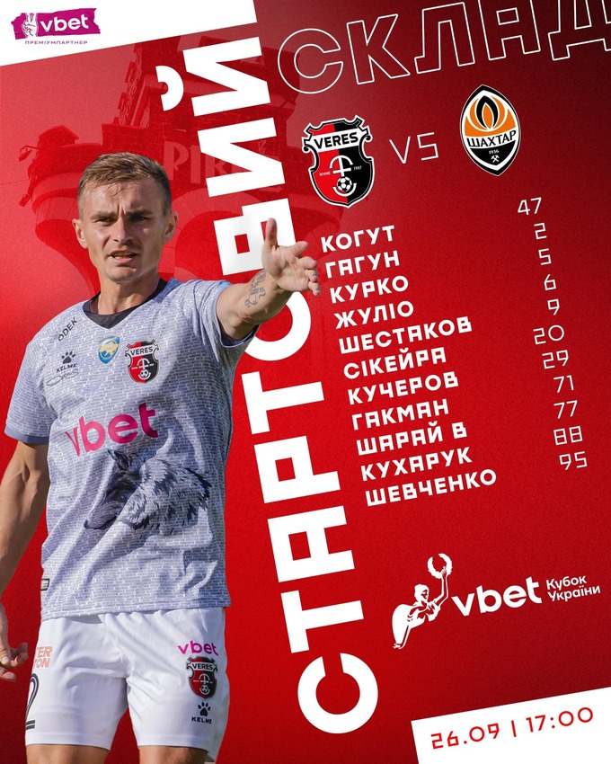 У вівторок, 26-го вересня, відбудеться поєдинок 1/8 фіналу Кубка України, у якому змагатимуться рівненський «Верес» і донецький «Шахтар». Матч пройде в Рівному, на полі стадіону «Авангард», початок о 17:00.