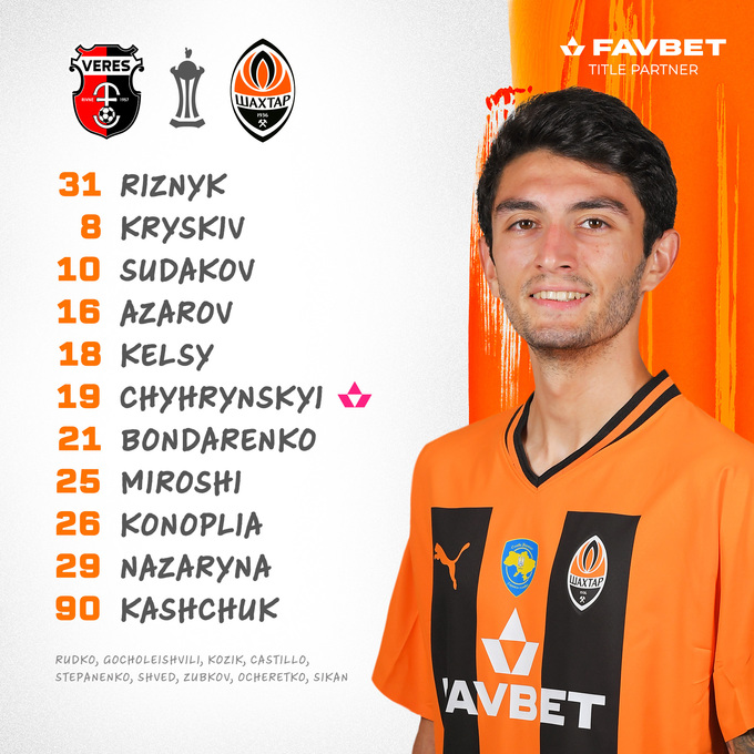 Шахтар: Різник, Конопля, Чигринський, Азаров, Міроші, Бондаренко, Криськів, Назарина, Кащук, Судаков, Келсі